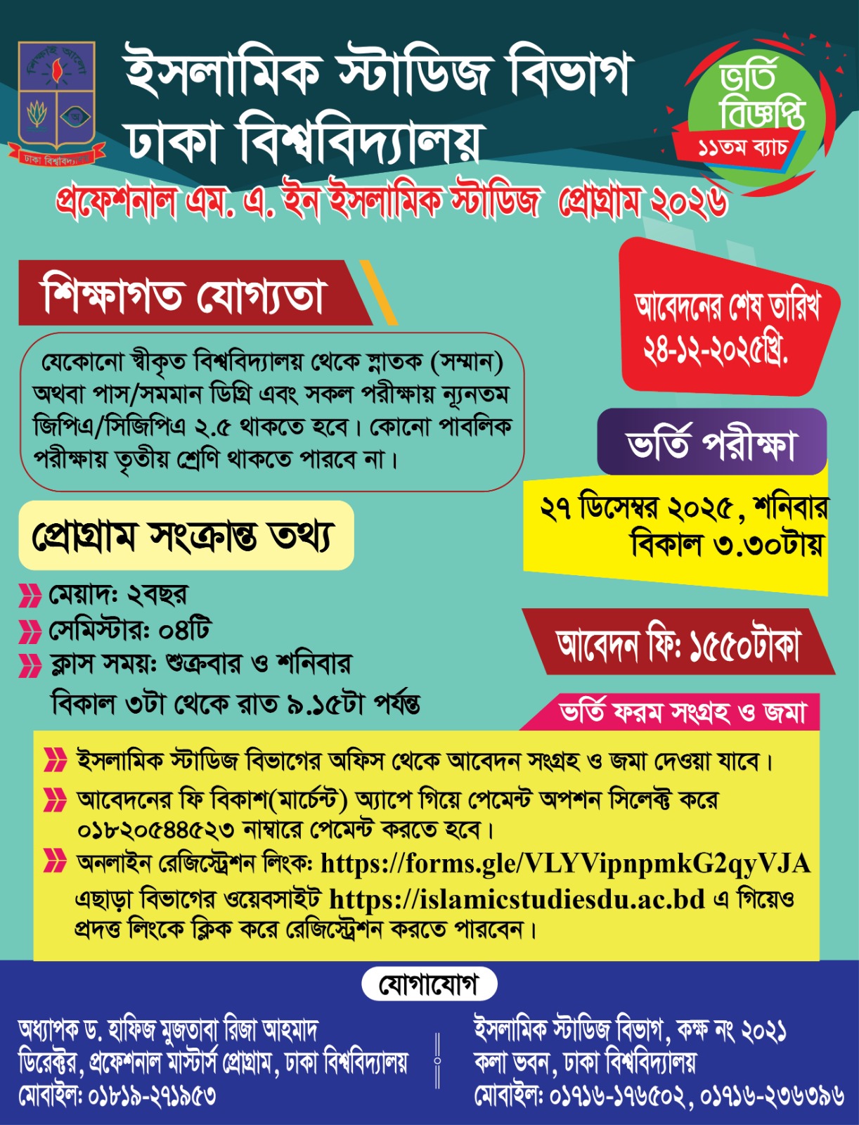 প্রফেশনাল এম.এ. ইন ইসলামিক স্টাডিজ প্রোগ্রাম-২০২৬। ইসলামিক স্টাডিজ বিভাগ। ঢাকা বিশ্ববিদ্যালয়। ১১তম ব্যাচে আবেদন আহ্বান করা হচ্ছে। আগ্রহী প্রার্থীকে সঠিক ভাবে আবেদন ফর্ম পূরণ করতে হবে।